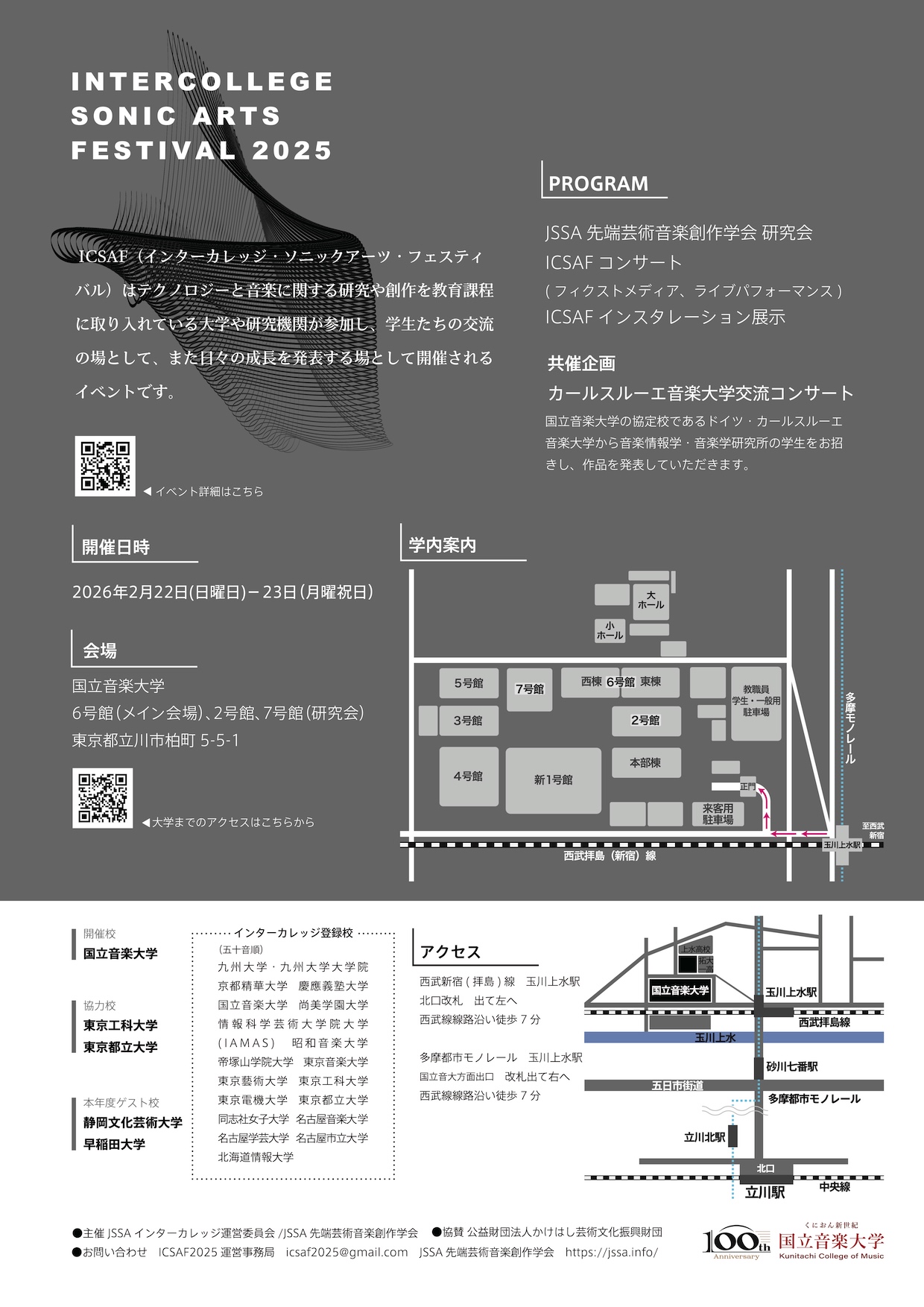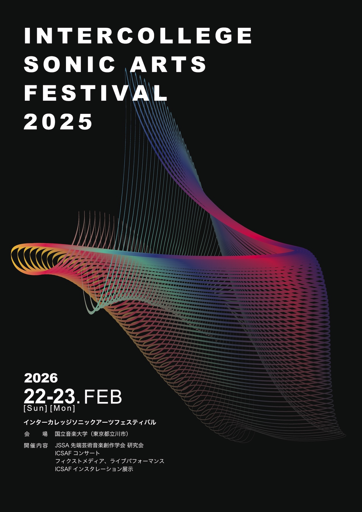 「インターカレッジ・ソニックアーツ・フェスティバル・ICSAF」は、JSSA先端芸術音楽創作学会のインターカレッジ運営委員会によって、テクノロジーと芸術の融合について学ぶ我が国の大学および研究教育組織に所属する学生・教員の情報交換や教育研究実践のために、学生の作品の上演や展示・研究発表を含む大きな年次イベントです。
